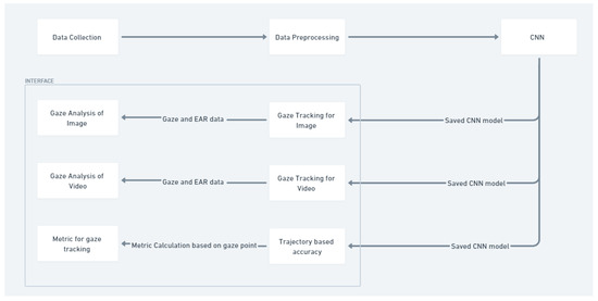 In this section, we propose a shallow CNN-based approach to gaze tracking, prioritizing computational efficiency and reduced complexity over deeper architectures like VGG16 or DenseNet. While deeper CNNs excel in feature extraction, their increased parameters can lead to overfitting with limited data. Our shallow architecture effectively captures essential features from the eye region, making it well suited for real-time gaze tracking with minimal computational resources. To provide a clearer understanding of the overall process, Figure 1 illustrates the flow of the proposed method, outlining the steps involved in data collection, data pre-processing, and data analysis.