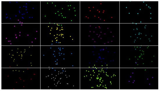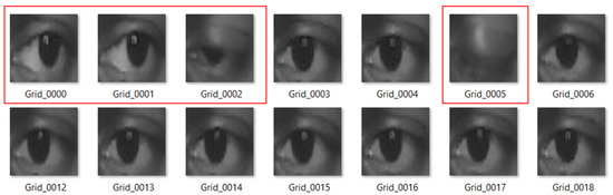 To facilitate data collection, the screen is divided into a grid of 16 cells, each containing a pulsating red dot at its center to draw the user’s attention (see Figure 2). The dot appears sequentially in each grid cell, remaining visible for five seconds to ensure accurate capture of the user’s gaze images. All participants sat comfortably in front of the screen, approximately 40 cm away from the webcam, focusing on the red dot as it moved across the screen. During this time, images of the right eye region were recorded in grayscale and resized to pixels.