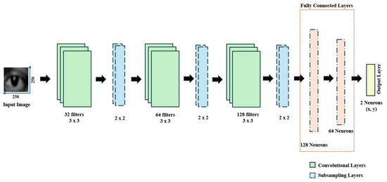 After pre-processing, the data are ready for the convolutional neural network (CNN) model. Its architecture, shown in Figure 5, comprises convolutional layers, pooling layers, fully connected layers, and an output layer. Convolutional layers extract hierarchical features using image convolution mechanisms, identifying patterns like edges and textures. Pooling layers reduce feature map dimensions, minimizing computational complexity and overfitting. Fully connected layers integrate the extracted features, enabling complex pattern recognition. The output layer predicts gaze coordinates for regression tasks. Model training involves optimizing weights through backpropagation, guided by a loss function, such as the mean squared error (MSE), to minimize prediction errors efficiently.