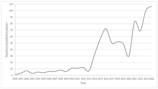 This section presents the temporal distribution of publications in the field of EDM and PM from 2000 to 2024. It includes an analysis of the evolution of keywords and research lines during this period, shedding light on the thematic focus and technological advancements that have shaped the domain. Additionally, future research directions are identified using score relevance, offering insights into emerging trends and priorities for advancing personalized learning and optimizing teaching methodologies through AI-driven approaches.