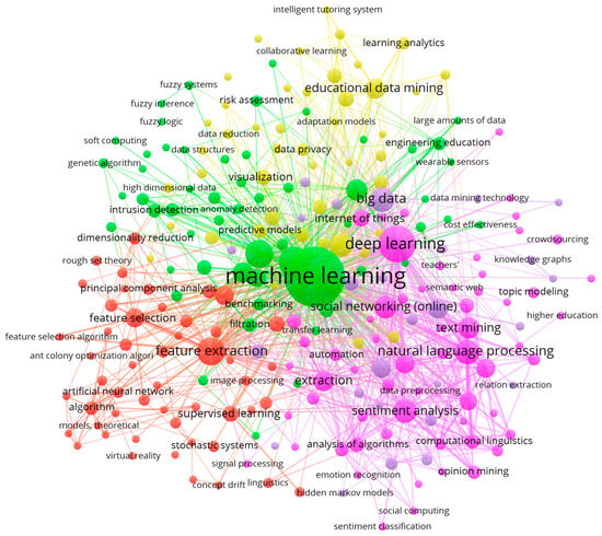 The network maps generated by VOSviewer illustrated the evolution of research themes over time. Clusters of related terms were identified, reflecting interconnected areas of study. For example, one cluster might focus on predictive analytics and its applications in identifying at-risk students, while another might center on the integration of AI-driven adaptive learning platforms. These clusters provided a nuanced understanding of how various subfields interact and how they contribute to the overarching goals of improving educational practices through technology [52,53].