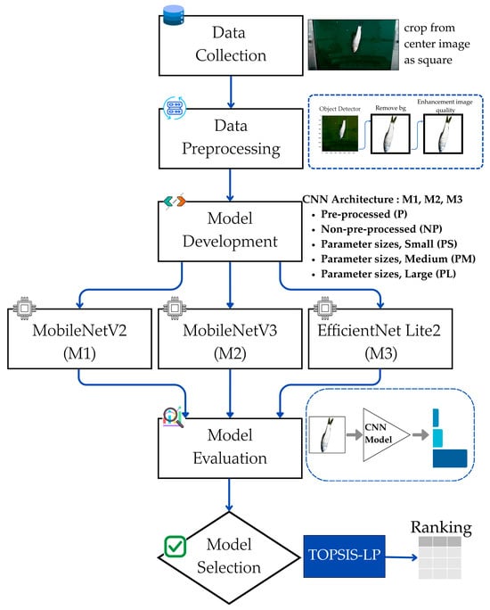 This section presents the methodology for evaluating deep learning models in fish freshness assessment, encompassing data collection, preprocessing, model selection, and performance evaluation. Images of Silver Barb were systematically collected from the Lam Pao Dam in Kalasin Province, Thailand, using a 2K QHD high-resolution webcam, with samples categorized into three freshness levels. Two preprocessing approaches were employed: one using raw images and the other integrating YOLOv8 for automatic fish detection, cropping to 224 × 224 pixels, and background noise removal. Three lightweight CNN models, MobileNetV2, MobileNetV3, and EfficientNet Lite2, were trained under 18 different configurations, combining model type, size (small, medium, large), and preprocessing method (with/without preprocessing) to optimize computational efficiency and classification accuracy. Model evaluation focused on classification accuracy, inference speed, and computational efficiency, with the TOPSIS-LP method applied to rank the models and select the most suitable configuration for real-world deployment in an automated fish quality sorting machine. This comprehensive methodology ensures a balanced approach to maximizing accuracy and processing speed, addressing the practical needs of fishery-based community enterprises. The framework for this study is shown in Figure 1.
