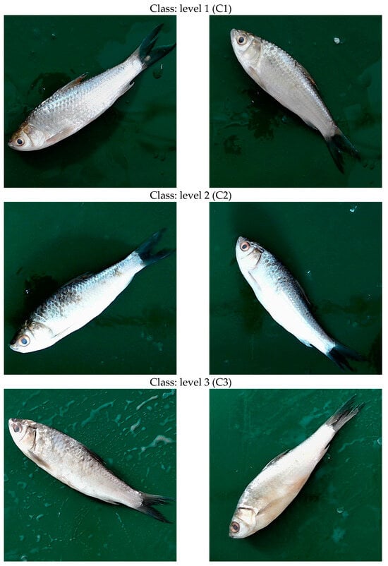 This study involved the systematic collection of Silver Barb images from the Lam Pao Dam in Kalasin Province, Thailand, forming a comprehensive dataset for fish freshness classification. Images were categorized into three freshness levels: C1 (1–2 days, optimal freshness), C2 (3–4 days, moderate freshness), and C3 (5–6 days, significant degradation). A 2K QHD high-resolution webcam was used for image acquisition, ensuring clarity in texture, color, and structural integrity, with standardized lighting and noise reduction techniques applied for consistency. The final dataset consisted of 1200 high-resolution images (1920 × 1080 pixels), evenly distributed across three categories (400 per class) to minimize bias and ensure fair model evaluation. This balanced and high-quality dataset served as a robust foundation for training deep learning models, enabling accurate assessment of classification performance and comprehensive analysis of freshness impacts on fish quality. Figure 2 showcases representative samples for each category: C1 displays vibrant color and intact texture, indicating optimal freshness; C2 presents slight dullness and minor texture changes, reflecting moderate freshness; and C3 shows visible degradation, characterized by faded color and roughened texture, signifying diminished freshness. This detailed categorization facilitates precise model training and evaluation, enhancing the accuracy and reliability of freshness classification.