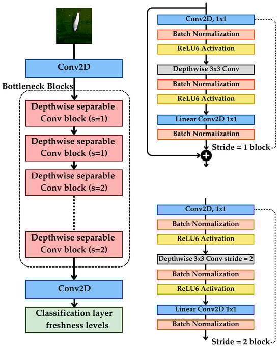 Figure 3 illustrates the MobileNetV2 architecture for fish freshness classification. The input image undergoes initial convolution (Conv2D), followed by bottleneck residual blocks, where depthwise separable convolutions extract essential features while reducing redundancy. The stride = 1 blocks refine features, while stride = 2 blocks perform downsampling, balancing detail retention and computational efficiency. Finally, the extracted features pass through the classification layer, predicting fish freshness levels.