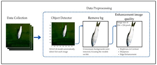 Data preprocessing significantly impacted model performance. Models trained with preprocessed data consistently outperformed those trained with raw images. The integration of YOLOv8 for object detection, followed by cropping and background noise removal, enhanced image clarity and standardized the dataset. This approach enabled models to focus on relevant fish characteristics, improving classification accuracy and robustness. These findings align with prior studies emphasizing pre-processing’s importance in image-based classification tasks [,].