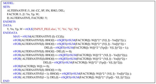Upon obtaining the relevant parameters displayed in Table 2, the associated parameter values are input into the TOPSIS-LP model, as indicated by Equation (7), and subsequently computed using Lingo software version 13. Details of the Lingo code are shown in Figure 8.
