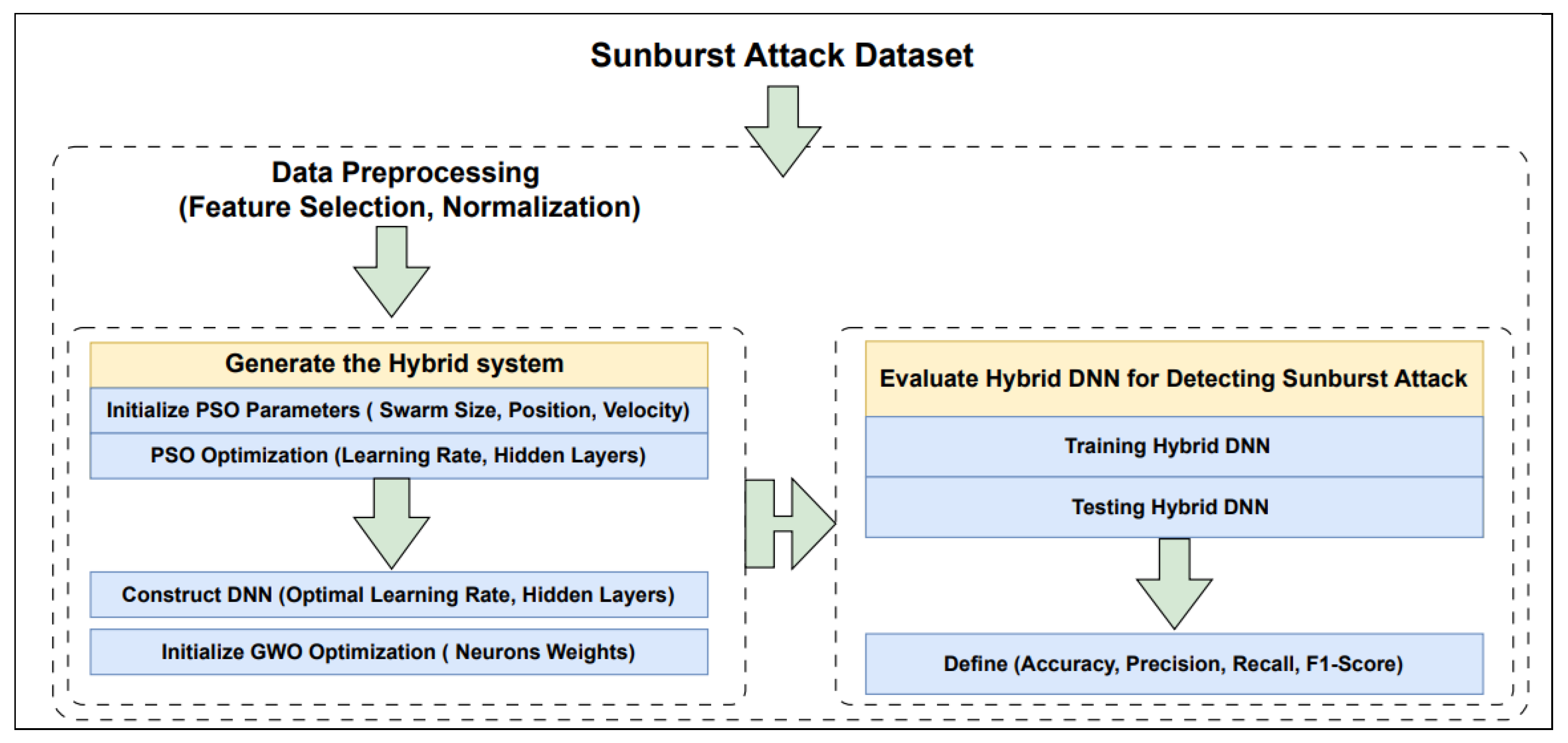 Despite the significant successes of PSO and GWO, there remains a gap in the literature regarding their hybridization and application to IDS challenges such as Sunburst attack detection, especially using DNN. The Sunburst attack was launched in 2020 and is considered a type of supply chain attack concerned with SolarWinds’ Orion software [22,23,24,25]. According to the Danish report from the Danish Centre for Cyber Security (CFCS) [26], 18,000 organizations were infected by these backdoor attacks. Despite its damage impact, there is a lack of research utilizing deep learning approaches, particularly DNNs optimized by metaheuristics, for detecting such advanced cyberattacks. On the other hand, the PSO algorithm has its key strengths, and the GWO algorithm has its key strengths. Hybridizing both algorithms could overcome the expected limitations of these algorithms and offer more robust results. This work aims to fill this gap by combining PSO-GWO with DNN to detect Sunburst attacks. The suggested hybridization tackles the capabilities of PSO in exploitation as well as the capabilities of GWO in achieving a more balanced and effective optimization process. The main contributions of this work as manifold, as follows:
