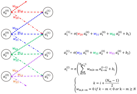 Illustration of a basic CNN along with its mathematical representation: denotes the i-th node in the l-th layer, while represents the weight linking the j-th input node to the i-th output node. denotes the bias associated with the i-th node. N corresponds to the input array size, whereas Nm specifies either the kernel size or the number of weights linked to each node. The function σ represents the sigmoid activation function.