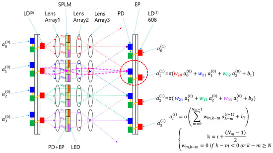 An example of an SPOCNN utilizing free-space optics with lens arrays and an SPLM: Schematic representation and corresponding mathematical formula. The SPLM used in the SPOCNN includes smart pixels comprising a photodetector (PD), electronic processing (EP), and a light-emitting diode (LED). The smart pixels receive light input and emit output light proportional to the weight value stored in the EP memory. The LD can be either a laser diode or an LED.