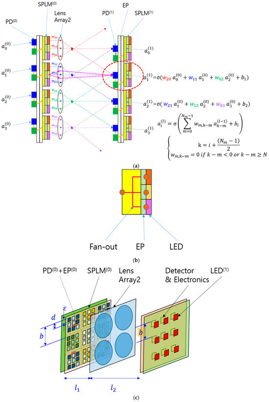 The simplified version of the SPOCNN utilizing electrical fan-out: (a) Schematic representation and corresponding mathematical formula. Additionally, Lens 2 and Lens 3 in Figure 2 are combined into a single lens. (b) The SPLM used in the SPOCNN, where the electrical fan-out connects the input nodes to individual pixels in the SPLM. EP represents the electronic processor for each pixel, which includes memory and is connected to the LED output. (c) A three-dimensional view of the system with 3 × 3 inputs and 3 × 3 outputs. Ε represents the size of the light source in the SPLM, while b, and d indicate the spacing between detectors (or subarrays) and smart pixels, respectively. L1 and l2 denote the distances from Lens 2 to the SPLM and the detector, respectively.