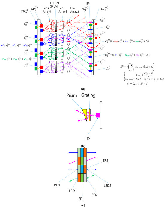 The use of the SPLM instead of the SLM in an SOCNN [16] can also be adapted for application in BONN [23], as depicted in Figure 4a. In this SPBOCNN architecture, the SPLM takes over the role previously held by the SLM, modulating light traveling in both forward and backward directions based on the neural network’s weight values. With the help of Lens 2 and Lens 3, the SPLM pixels’ images are projected onto the detector plane or the second substrate, which also houses light sources () to facilitate backward light propagation, as shown in Figure 4b. These backward light sources may consist of laser diodes combined with a grating and prism for beam property control. The beams passing through the SPLM are focused onto PDs () on the first substrate, maintaining compatibility with the backward propagation process. Even with the replacement of the SLM by the SPLM, the core BONN structure remains intact, with a significant enhancement in modulation speed.
