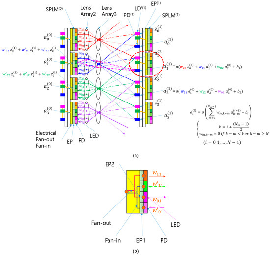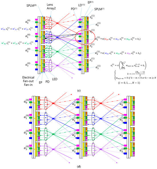 The SPOCNN architecture can be further refined by substituting LD(0) and Lens 1 with an electrical fan-out, as illustrated in Figure 3a. A more detailed depiction of the electrical fan-out is provided in Figure 3b. In the initial design, the light source and Lens 1 act as an optical distributor for the input signal. In contrast, the electrical fan-out in Figure 3a,b functions as an alternative distributor within the electrical domain. This configuration utilizes a direct wiring scheme that links the output of the previous layer to the inputs of the SPLM pixels in the next layer. By implementing this approach, wiring complexity and electromagnetic interference are minimized, leading to a more streamlined and efficient system.