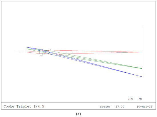 A design example of Lens 2 for SPOCNN is illustrated in Figure 6. The design was carried out using the optical design software CodeV (Ver. 2023.03) for an 850 nm wavelength, with optimization starting from a Cooke triplet. The entrance pupil diameter and magnification are 0.4 mm and 5.0, respectively. The kernel array size is 5 × 5, with dimensions of 0.200 × 0.200 mm2, allowing for a square pixel pitch and size of 40 µm and 10 µm, respectively. The distance from the center to the corner of the kernel array is 0.28 mm, which is why the three field points are set at 0.0, 0.2, and 0.3 mm.