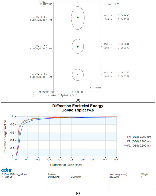 A design example of Lens 2 for SPOCNN with a kernel size of 5 × 5, based on a Cooke triplet at 850 nm: (a) Lens layout; (b) spot diagram with a circle indicating the Airy disk; (c) diffraction encircled energy.