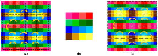 This necessity is why boundary cells must be preserved when transitioning to the next block. Notably, the boundary cells retain their colors when shifting to neighboring blocks, as indicated by the yellow arrows in Figure 7a. The consistent color signifies that the same hardware input nodes are used for their calculation. Thus, transitioning between blocks is not a simple translational shift but rather a topological “flipping”.