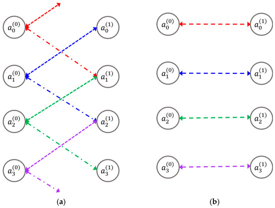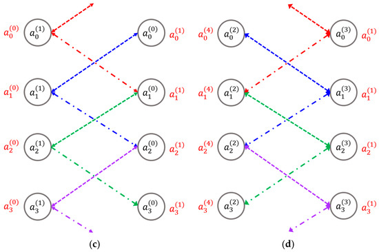 In general, these local interactions can be represented by the convolutions of a neural network. The steps performed by TML-SPBOCNN are illustrated in Figure 9. First, the convolution of the zeroth-layer and first-layer nodes is calculated and stored in the nodes on the opposite side, with data transfer occurring simultaneously in both directions using TML-SPBOCNN, as shown in Figure 9a. Second, copies of the zeroth and first layers are exchanged. Third, since the node values of the first layer are stored on the left side and the zeroth-layer values on the right during the second step, the convolution of the first layer on the left and the zeroth layer on the right is added to the previously stored values (indicated in red) on the opposite side. Fourth, the convolution of the second-layer and third-layer nodes is computed and stored in the layer on the opposite side, with data transfer occurring simultaneously in both directions. The convolution of the second layer is added to both the stored first-layer value (indicated in red) and the third-layer value. Similarly, the convolution of the third layer is added to the second-layer value and stored for the fourth-layer value (indicated in red). In this manner, the nodes in the first layer collect values from their neighbors in three dimensions, completing the local interactions for the first layer. For the remaining steps, the calculations repeat those shown in Figure 9a–c. The step shown in Figure 9d represents the first step of the second cycle.