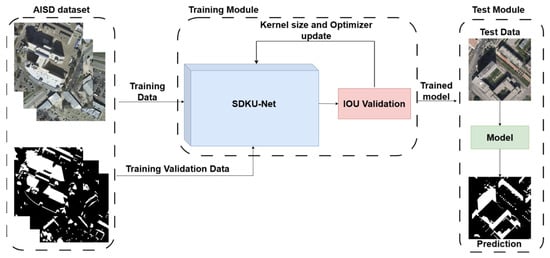 Figure 1 illustrates the general methodology of the proposed training model, highlighting the SDKU-Net architecture. The training dataset selected is AISD, a widely recognized dataset for shadow detection in remote sensing. The processed data are input into the SDKU-Net, which is complemented by an IoU validation module. This module monitors segmentation performance during training to determine kernel size adjustments dynamically. Finally, the test phase is conducted after completing the training process to assess the model’s generalization capabilities and validate its performance on unseen data.