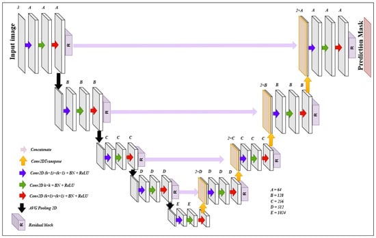 The proposed model, SDKU-Net, is built upon the U-Net architecture, which features an encoder–decoder structure with skip connections. This design enables the model to effectively capture both global context and local details. As illustrated in Figure 2, each block within the encoder and decoder comprises three convolutional layers with kernel sizes k − 1, k, and k + 1, along with Batch Normalization (BN) applied after each convolutional layer, followed by activation functions (ReLU). This configuration enhances training stability and efficiency by normalizing the inputs to each layer. Additionally, the incorporation of residual connections facilitates gradient flow throughout the network.