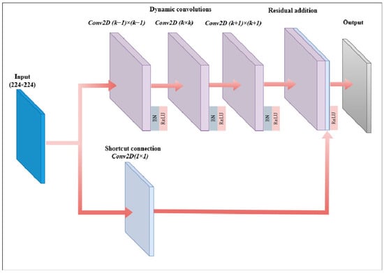 The shortcut connection is established by applying a 1 × 1 convolution to the input. This operation ensures that the number of feature channels in the input matches those of the output from the convolutional layers, enabling proper residual addition without altering the spatial dimensions of the feature maps. The dynamic convolution block comprises three convolutional layers, each utilizing a Conv2D operation with kernel sizes of , , and . This design allows the network to capture spatial features at multiple scales throughout the training process. In this regard, smaller kernel sizes allow the network to focus on local features, which is beneficial for tasks that require improved edge detection or subtle texture recognition. Larger kernels can capture broader contextual information but may miss finer details. Each convolutional layer is followed by BN and a ReLU activation.