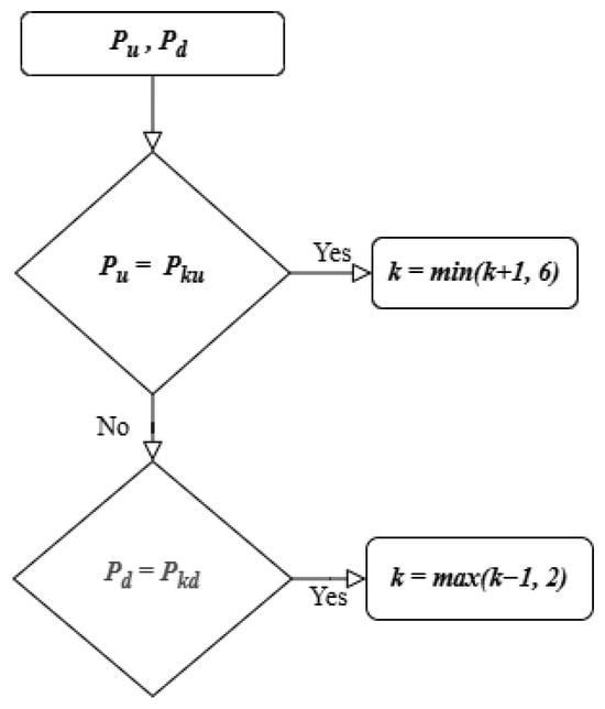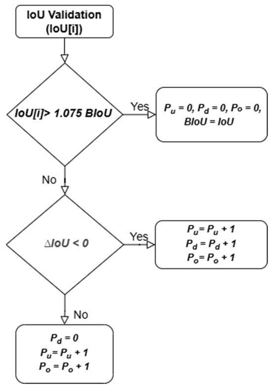 After the IoU evaluation process, the kernel adjustment mechanism is executed, as illustrated in Figure 7. This process takes the previously calculated patience counters at a specific epoch as inputs to determine whether the patience thresholds for modifying the kernel size have been reached. Specifically, denotes the patience value required to trigger an increase in kernel size, set to 10, while corresponds to the patience value for decreasing the kernel size. When either of these thresholds is reached, all patience counters are reset to zero, and the appropriate kernel size adjustment is applied. This method ensures a systematic adaptation of the kernel size, balancing feature extraction capabilities with computational efficiency.