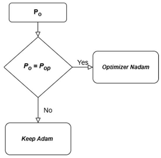 The optimizer-switching mechanism is designed to address long-term stagnation in network training and is illustrated in Figure 6. The process uses (current performance metric) as input and (patience parameter), set to 25 in this study. If the training process fails to yield significant improvements over consecutive epochs, the mechanism triggers a switch from Adam with AMSGrad to Nadam. This transition facilitates further improvements in network performance with minimal computational overhead. By combining the strengths of Adam and Nadam, the proposed mechanism ensures effective convergence and enhances the model’s ability to capture intricate patterns in the data.