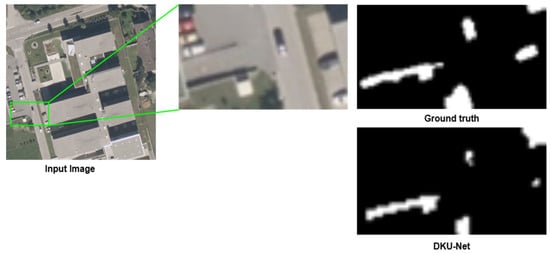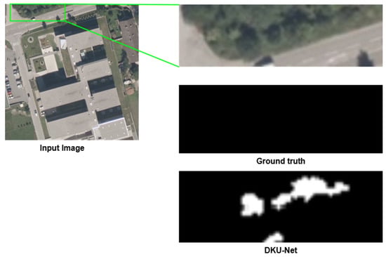 As demonstrated in the previous sections, the proposed DKU-Net provides a novel approach to segmenting intricate shadow details, which is particularly valuable in remote sensing images. Shadows in these images often vary in shape, size, and texture within the same region, making accurate segmentation challenging. The results, as illustrated in Figure 11, showcase how DKU-Net shows notable performance in identifying these fine details, resulting in improved segmentation quality.