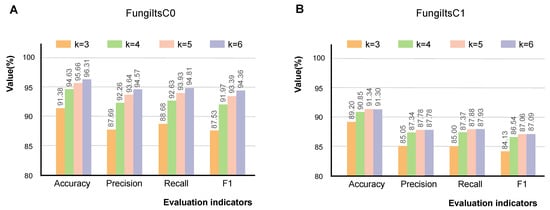 (A) Evaluation of different k-value selections on the FungiItsC0 dataset. (B) Evaluation of different k-value selections on the FungiItsC1 dataset.