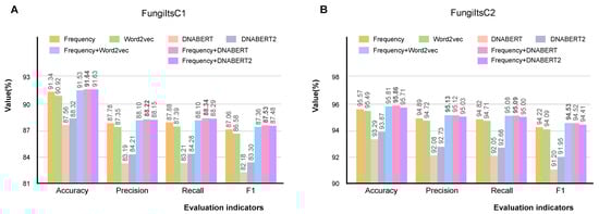 Evaluation of sequence feature extraction potential using different encoding methods and evaluation of dual channel feature fusion mechanism. (A) Evaluation of the classification performance of different sequence encoding methods and fusion mechanisms on the FungiItsC1 dataset. (B) Evaluation of the classification performance of different sequence encoding methods and fusion mechanisms on the FungiItsC2 dataset.