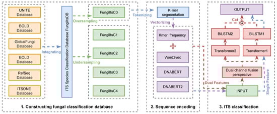 This study conducted rigorous screening and quality control of multiple publicly available datasets, integrating and constructing an ITS sequence classification database that encompasses a broader diversity of fungal species. Multiple balanced datasets with different sample sizes were constructed by oversampling and undersampling the FungiItsDB database. ITS sequences were processed using the k-mer segmentation method, and various sequence encoding techniques were applied to vectorize the k-mer fragments. These vectorized sequences effectively represent the features of the ITS sequences and meet the input requirements of deep learning models, thereby supporting downstream species classification tasks. We designed and developed a fungal species classification model named FungiLT, which incorporates BiLSTM and Transformer as its core components. This model performs deep feature extraction and analysis on encoded ITS sequences, enabling efficient species classification. Additionally, we designed a dual-channel feature input mechanism in the FungiLT model, aiming to integrate classification features extracted from two different encoding methods, thus fully leveraging the advantages of diverse sequence encoding approaches to enhance classification accuracy. Figure 3 illustrates the overall workflow of this study, including the data processing pipeline, sequence encoding methods, and the architecture of the FungiLT model.