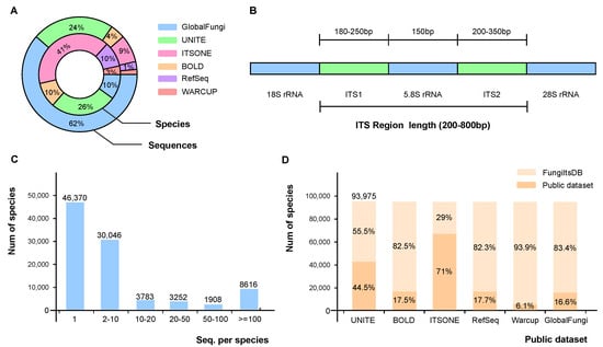 (A) Statistics on the number of species and sequences in six publicly available datasets collected from this article. (B) Described the basic composition structure and length information of ITS sequences. (C) The distribution of sequence quantity corresponding to species in the FungiItsDB database integrated and constructed in this article. (D) The expansion of species diversity in the FungitDB dataset relative to six public datasets has been statistically analyzed.