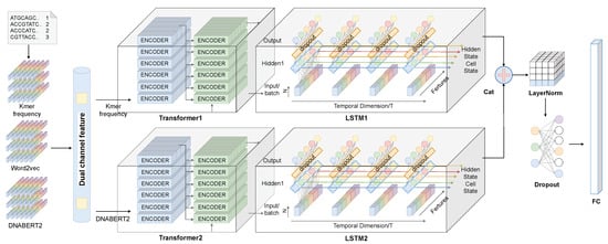 The input data features and shape are primarily determined by the k-mer size and sequence encoding method. The model accommodates various state-of-the-art encoding techniques, enabling it to flexibly adapt to diverse sequence characteristics. Feature extraction is performed using Transformer and BiLSTM, with Dropout employed to mitigate overfitting by randomly deactivating neurons during training, and LayerNorm normalizing the output to enhance stability and accelerate convergence. The model also supports the simultaneous input of two distinct sequence encoding features. After processing, the resulting feature representations are concatenated, effectively combining the classification outcomes of both encoding methods.