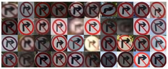 Data augmentation is a technique used to increase the number and diversity of data available for training models by applying some transformations to the images in the training set. Diversity augmentation is significantly important in time-series regression because it increases the variability of the training data, improves the model’s generalizability, and reduces overfitting. This improves the robustness and accuracy of traffic sign detection in many real-world scenarios. Common data augmentation techniques include translation, zooming, rotation, brightness, and scale modifications [,]. Many works have focused on designing data augmentation methods specifically for TSR. A research by Ge [] introduced an innovative domain adaptation approach using the standard of traffic signs. The method, known as TSR dataset augmentation, addresses the issue of imbalanced datasets where some classes of traffic signs do not possess adequate examples for effective model training. Applying the proposed TSR dataset augmentation to TT110k improved the usability of the dataset for training models based on fewer examples. This method was validated with many generations of the dataset. The results showed the ability of the proposed method to improve the performance of the models, despite unbalanced class instances being a challenge.