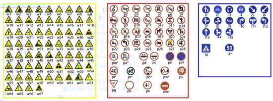 A list of traffic signs and their labels in the TT100K dataset [], grouped according to their classification (red, blue, and yellow denote prohibitory, mandatory, and warning signs, respectively).