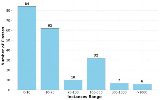 As seen in Figure 4, the TT100K dataset consists of 201 traffic sign classes in total. The distribution of instances per class exhibits a significant imbalance. The majority of classes contain relatively few instances, while only a small subset has a large number of samples. Specifically, 84 classes have fewer than 10 instances, making them highly underrepresented in the dataset. Furthermore, 62 classes have between 10 and 75 instances, and 10 classes have fewer than 100 instances, further demonstrating the class imbalance issue.