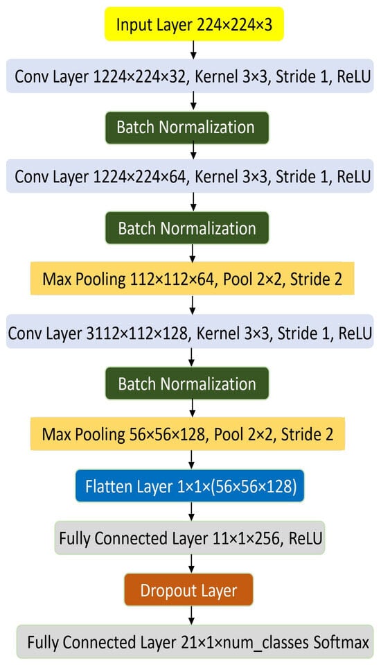 The CNN architecture proposed for TSR aims to achieve a balance between computing efficiency and feature extraction, which empowers the accurate classification of traffic signs. The third convolutional layer allows the model to be non-linear, applying Rectified Linear Unit (ReLU) activation function after every layer. The first two convolutional layers use 3 × 3 kernels with a stride of 1 to capture the spatial features of input images. During the training process, for the purpose of stabilization and acceleration of the training process, batch normalization is applied after each convolutional layer.