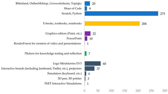 As shown in Figure 4, many teachers (275 or 95.16%) use programming languages such as Scratch and Python 3.7. in their computer science classes to introduce students to essential problem-solving topics and tasks, etc. Additionally, 206 teachers (71.28%) work with digital books and textbooks with different modules for first to fourth grade. At the same time, they use notebooks, which are not used in all schools as these learning aids are not available for all students. Notably, 20 ICT teachers (6.92%) prefer to use online platforms and draw children’s attention to interesting topics on websites and platforms such as Bilimland, OnlineMektep, Topiq.kz and Liveworksheets. Only nine respondents (3.12%) usually work on Code.org [21]. In addition to different platforms, websites, e-books, and textbooks, teachers also use computer software to teach children how to work with simple applications. Children learn to colour pictures and create their first presentations in Paint and PowerPoint. Regarding robotics kits, only 60 teachers (20.76%) responded that they use Lego Mindstorms EV3. 37 (12.80%) use interactive whiteboards (including Jamboard and Padlet) and projectors in their classrooms.