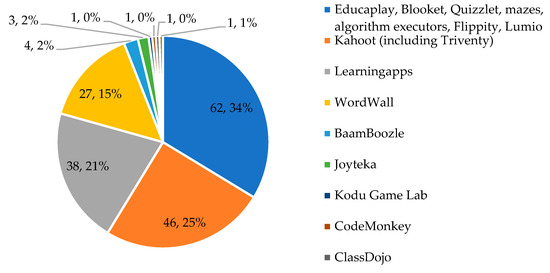 Forty-six respondents (25%) work with children on the Kahoot game learning platform, including a game and quiz builder Triventy in their classroom. Thirty-eight online questionnaire participants (21%) like to use the Learningapps interactive online exercises platform. In contrast, another 27 ICT teachers (15%) prefer to work with the WordWall platform, which facilitates quizzes and word games, among other functions. Four educators answered that they use BaamBoozle. Joyteka for games attracted the other three people. The other four teachers used the Kodu game lab, CodeMonkey, ClassDojo, and OnlineTestPad for crossword puzzles, tests, and questionnaires.