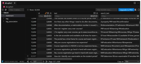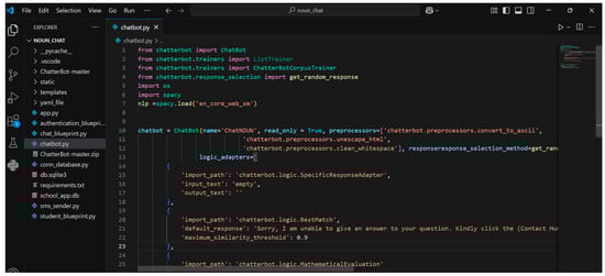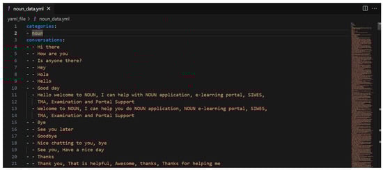 The dataset was made of a predefined dataset (greeting.yml) from ChatterBot that was made of 53 records and the custom data (noun_data.yml) shown in Figure 4; comprising 673 records, the custom dataset was collected from the NOUN academic support unit. The first time the application was executed, the ChatterBot library handled the training operation, which took about 20 s; this process automatically created and updated the default ChatterBot database db.sqlite3 in Figure 5.