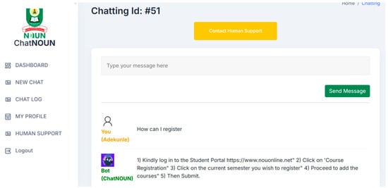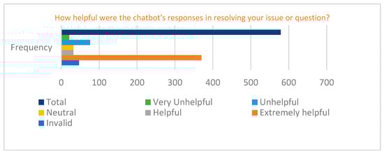 The data presented in Table 4 and Figure 10 highlight how beneficial users found the developed chatbot in resolving their queries or challenges. Among 579 respondents, 375, which represents 64%, rated the chatbot as “Extremely helpful”, and 5.5% rated it as “Helpful”, which cumulates to a total of 69.5% favourable ratings. Additionally, 5.5% of respondents were “Neutral”, meaning they were neither satisfied nor dissatisfied. But 13.5% of users rated the chatbot as “Unhelpful”, and 3.5% opined that it was “Very Unhelpful”. Unfavourable ratings were provided by 17% of students. In addition, 42 invalid responses, representing 8% of the total respondents, were also noted. These results imply that the chatbot works effectively for the majority of users, although it could be improved to do a better job of attending to the issues raised by the unfavourable minority. Even though the chatbot performed very well as rated by the majority of the respondents, scalability [56] is a major drawback to consider. As the user base expands, the chatbot may find it difficult to handle a growing number of concurrent enquiries without seeing a drop in accuracy or response time. This may result in inaccurate or irrelevant information being provided and a misconception of the user’s purpose. In the developed system, complex questions are channelled and handled by the support team.