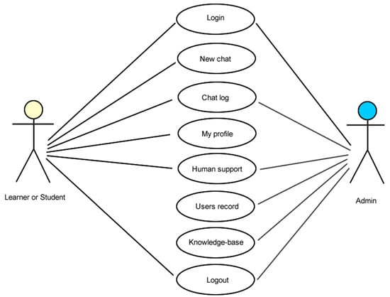 There are two categories of users that could login to the system: the student or prospective learner and the admin. Figure 6 shows the Use Case diagram that depicts the possible interaction of this user with the chatbot system.