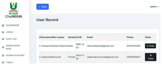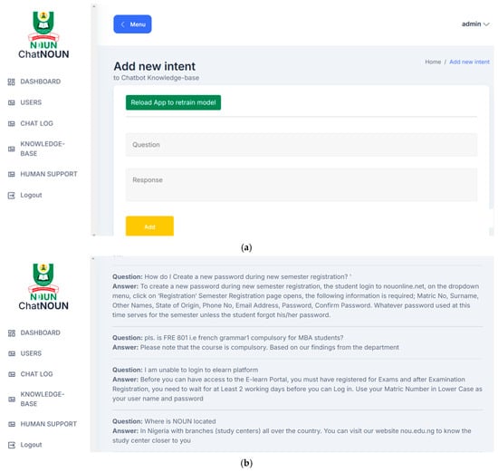As depicted in the Use Case Diagram (see Figure 6), the prospective student or learner could chat with the chatbot and see the chat log. The admin can view all registered users and their chat log (see Figure 7); this helps the admin to know the effectiveness of the chatbot. The admin can also view complex questions that the chatbot could not handle and give corresponding solutions to it. The solution provided will be added to the knowledge base, as shown in Figure 8a, and the model will be retrained to update its knowledge base, as shown in Figure 8b.