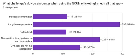 Figure 9, further provided information that 153, representing 30.8%, indicated that the students’ needs were not met through e-ticketing, while 112, representing 22.5%, indicated that the information the support team provided was inadequate and 106, which represents 21.3%, indicated that there was no feedback entirely. Delayed feedback has become one of the critical areas that need urgent intervention, as stated by [13,14] and authenticated by the findings from Figure 1 above. When there is delayed feedback, students tend to feel isolated, losing a sense of belonging, thereby abandoning their studies.