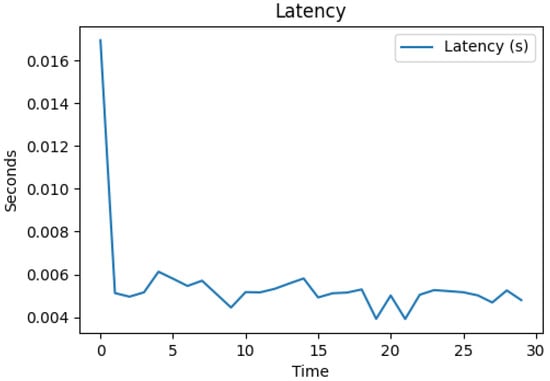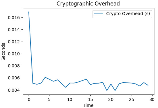 The latency starts high at approximately 0.017 s and rapidly decreases in the first few seconds. It fluctuates between approximately 0.004 and 0.006 s for the majority of the duration. There are minor variations, but no significant spikes or drops after the initial decrease, as depicted in Figure 5. It is remarkable that the overall processing latency pattern mirrors the cryptographic overhead, which indicates that the cryptographic verification is the dominant factor in the overall processing time.