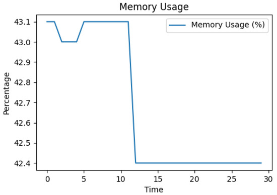 The memory usage depicted in Figure 6 starts at about 43.1% and remains stable for the first 10 min. Then, there is a sudden drop to 42.4% around the 12-min mark, which correlates with the CPU spike seen in Figure 3. The memory usage then stabilizes at a lower level for the remainder of the test. The drop might indicate garbage collection or optimization in the Python runtime.