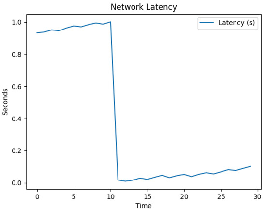 In Figure 7, the network latency is initially very high at around 0.95 s (950 ms). Then, at about the 10 min mark, there is a dramatic drop to near zero (around 0.02 s) before the latency then gradually increases over time, reaching about 0.1 s by the end of the test. This pattern suggests an initial network configuration or connection establishment overhead, followed by optimization and then a gradual increase, likely due to queue buildup.