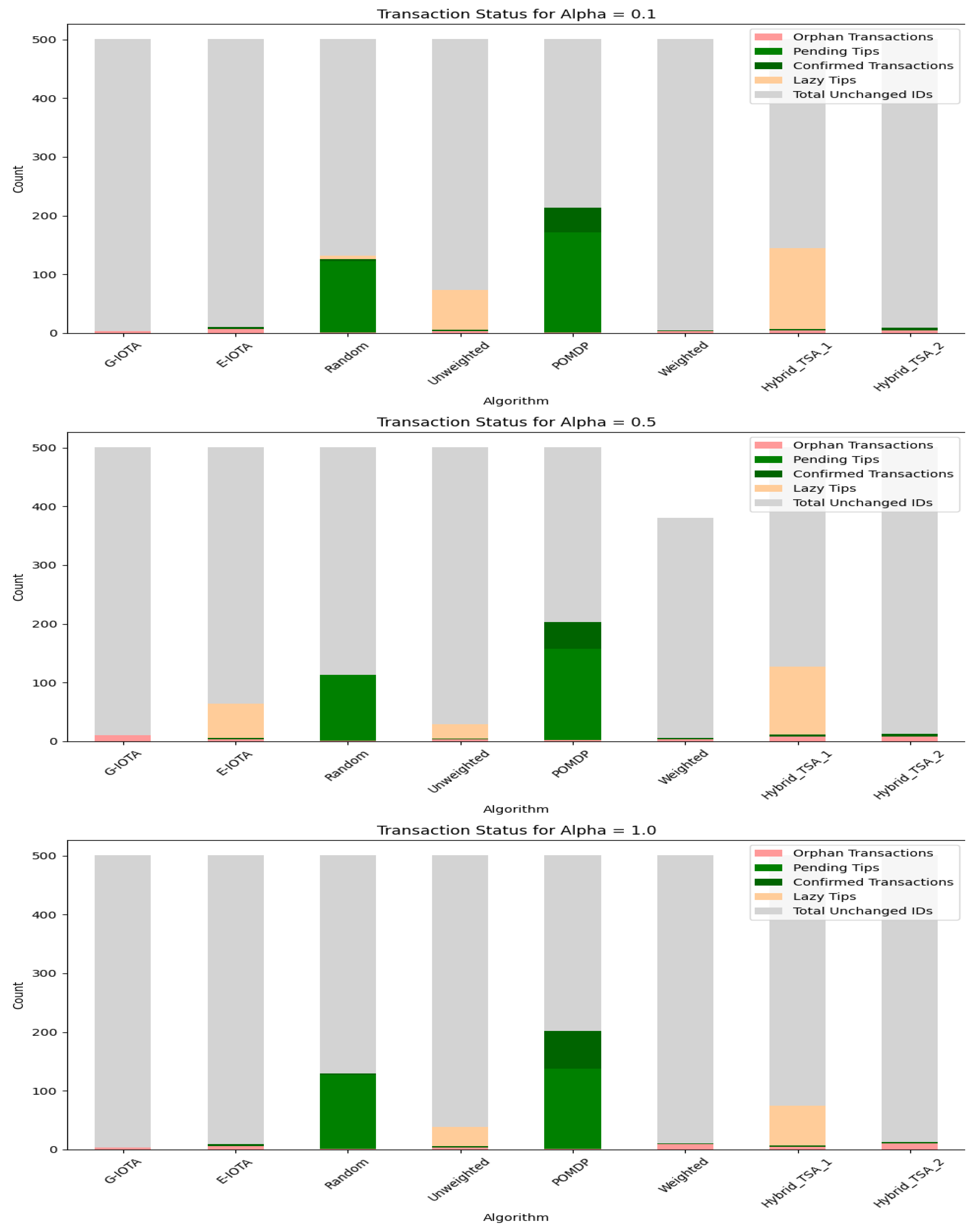 This section analyzes the impact of varying alpha values (0.1, 0.5, and 1.0) on the performance of various TSAs in a simulated environment with 500 transactions, 5 agents, and a lambda value of 1. The metrics analyzed include orphan transactions, pending tips, confirmed transactions, lazy tips, and total unchanged IDs. These metrics reveal how each algorithm behaves as the bias toward newer or older transactions is adjusted by the alpha value, as shown in
