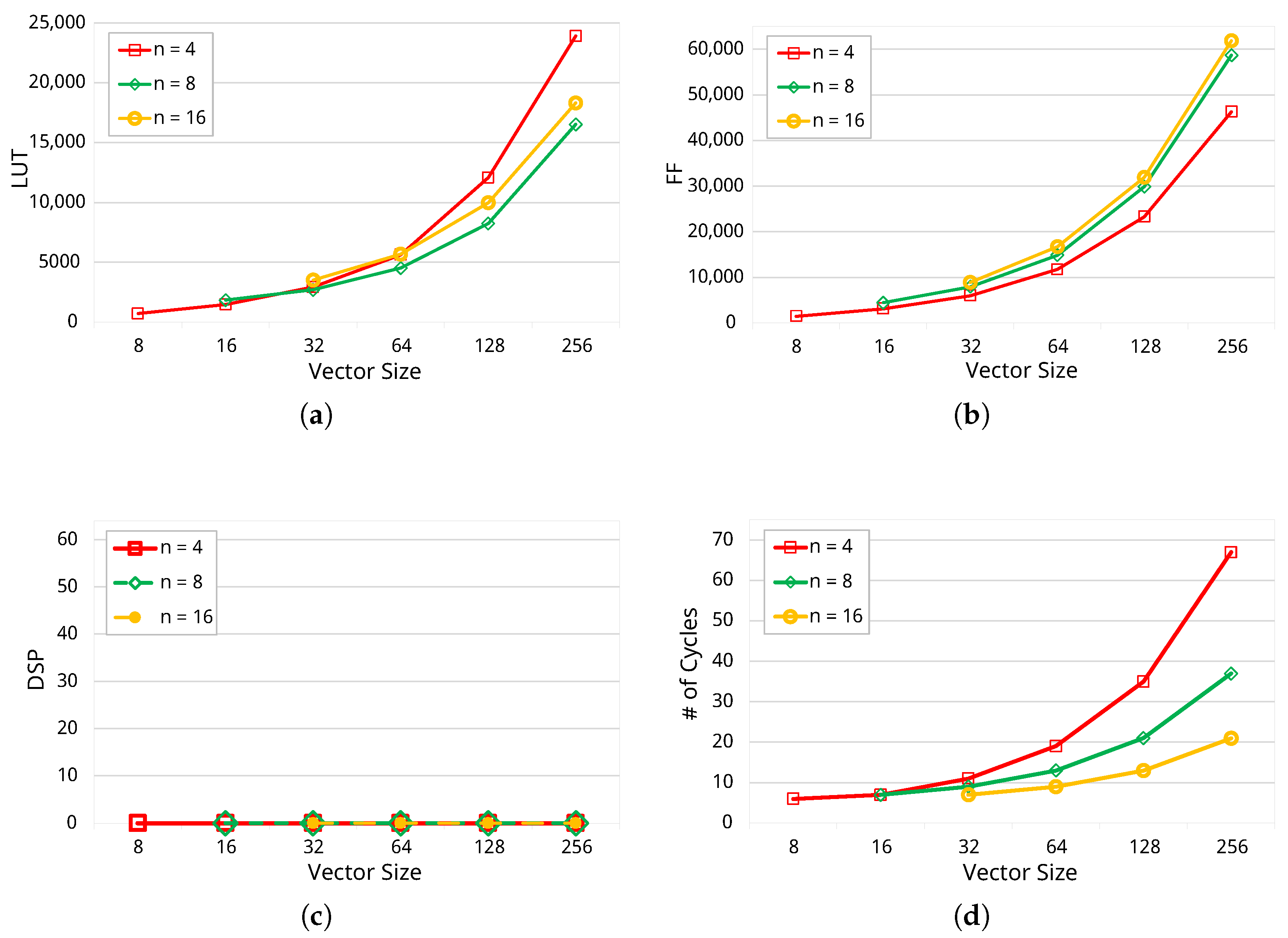 Comparing the resource utilization of vsum operation for different n (4, 8, 16); (a) LUT Utilization; (b) FF Utilization; (c) DSP Utilization; (d) Number of clock cycles.