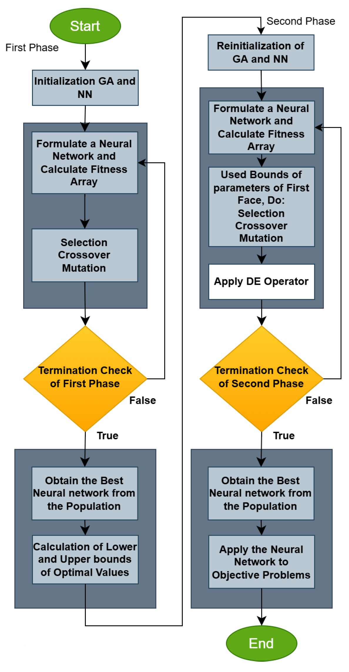This paper proposes a two-stage technique for the efficient training of artificial neural networks. In the first stage, a genetic algorithm is used to efficiently identify a range of values within which the parameters of the artificial neural network should be optimized. In the second stage, a genetic algorithm is used to optimize these parameters, and it uses a new operator to enhance the results. This new operator is based on the differential evolution technique [42], and it is applied periodically to randomly selected chromosomes of the genetic population. The first stage of the technique is necessary to ensure that the parameters of the artificial neural network are trained within a range of values, which will prevent their overfitting as much as possible. In the second stage, the differential evolution method is selected as the base of the new operator. This method is an evolutionary technique widely used in a series of practical problems, such as community detection [43], structure prediction [44], motor fault diagnosis [45], and clustering techniques [46]. Furthermore, this method is chosen as the basis for the new genetic operator due to the small number of required parameters that must be specified by the user.