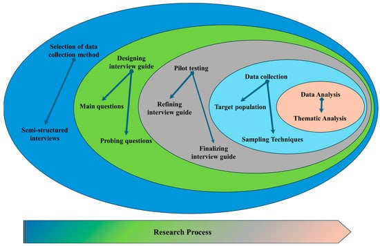 A qualitative research method utilizing semi-structured interviews was used to collect data. There are three types of interviews used in qualitative data collection, i.e., unstructured, semi-structured, and structured interviews [89]. Semi-structured interviews offer flexibility and deeper insights into the phenomenon under study [90,91] compared to surveys, which are restricted to specific responses. Additionally, semi-structured interviews provide consideration of personal context and deeper insights through tailored probing questions [92]. Therefore, based on the aim of the research, semi-structured interviews were conducted to obtain a deeper insight into the acceptance and adoption of multiple security tools and explore factors impacting the adoption behavior. The research process is presented in Figure 1.