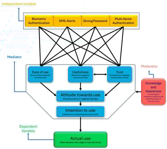 To guide this investigation, this study proposes an extended version of the TAM framework to include knowledge and awareness as a moderator, influencing customers’ perceptions. It also includes trust as a mediator, along with usefulness and ease of use, directly influencing customers’ attitudes towards use. This framework provides a distinct understanding of how security tools affect users’ acceptance and adoption to enhance cybersecurity resilience.